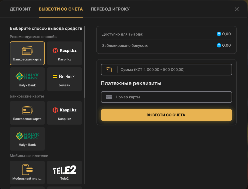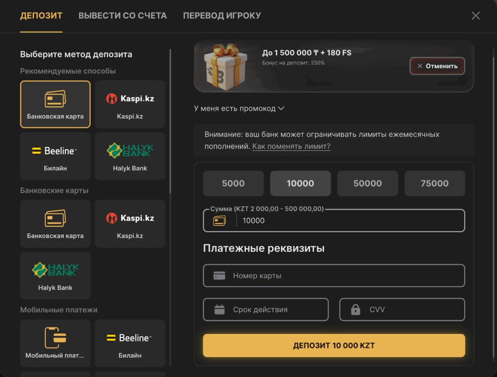Депозит от 2 000 KZT, вывод от 4 000 KZT.
